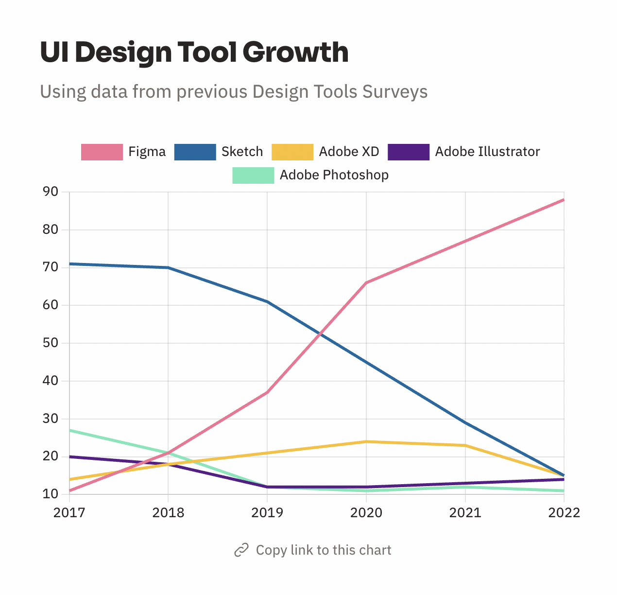 海外のUXツールを調査したサイトでも、2022年の使いたいデザインツール世界1位はFigmaで約9割、他との大差をつけている。
